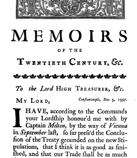 This is the opening page of one of the first science fiction works, Memoirs of the twentieth century (1733) by Samuel Madden, in which he tries to imagine life in the 20th century.