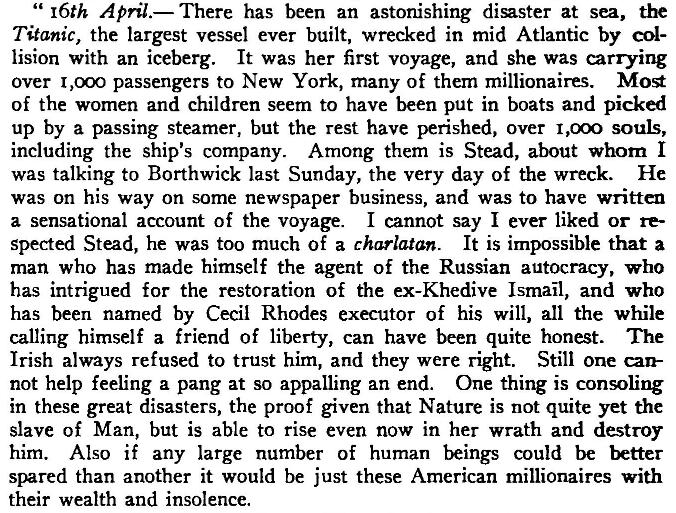 "16th April. - There has been an astonishing disaster at sea, the Titanic, the largest vessel ever built, wrecked in mid Atlantic by collision with an iceberg. It was her first voyage, and she was carrying over 1,000 passengers to New York, many of them millionaires. Most of the women and children seem to have been put in boats and picked up by a passing steamer, but the rest have perished, over 1,000 souls ... One thing is consoling in these great disasters, the proof given that Nature is not quite yet the slave of Man, but is able to rise even now in her wrath and destroy him. Also if any large number of human beings could be better spared than another it would be just these American millionaires with their wealth and insolence."