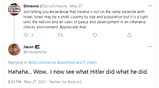 In response to an Israeli criticising Ireland, he declares: "I now see [why] Hitler did what he did".