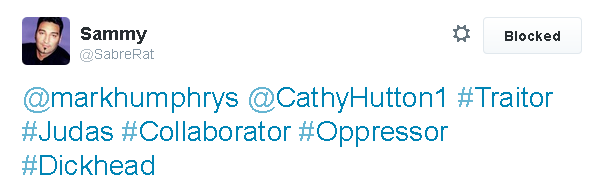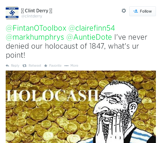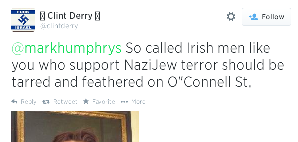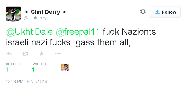 "clintderry", 15 July 2014, tweets my photo, and explains how "Jew lovers"
