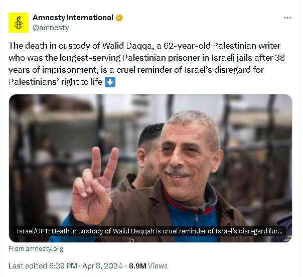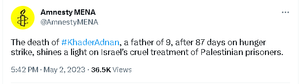 Amnesty MENA, 2 May 2023, mourns the death of Palestinian Islamic Jihad leader Khader Adnan.