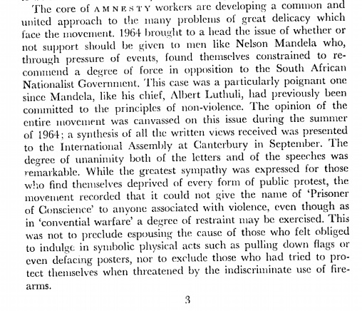 This is from their 1964-65 report: "the movement recorded that it could not give the name of 'Prisoner of Conscience' to anyone associated with violence". They refused to defend IRA prisoners in the Troubles because they were violent. They refused to support Mandela because he was violent.