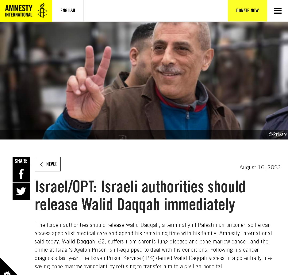 Amnesty, Aug 2023, campaigns for terrorist Walid Daqqa.