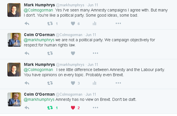 11 June 2016: Head of Amnesty Ireland (who later blocked me) assures me they have no position on Brexit. "Don't be daft."