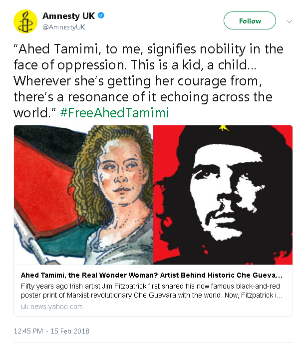 Amnesty UK, Feb 2018, promotes both the communist oppressor Che Guevara and the Palestinian radical Ahed Tamimi, who supports suicide bombing Jews.