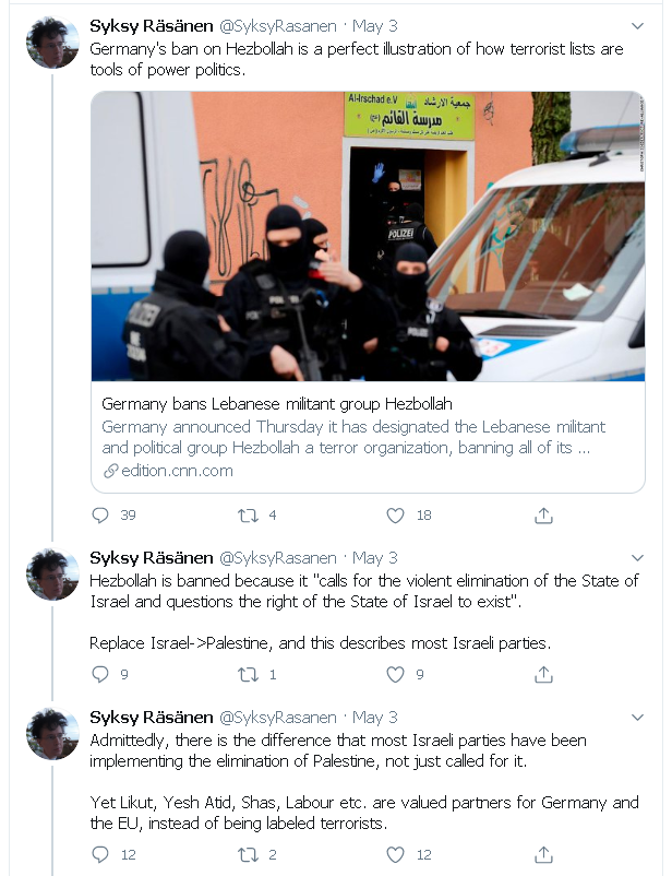 Syksy Rasanen, board member of Amnesty Finland, is angry at Germany banning Hezbollah, May 2020.