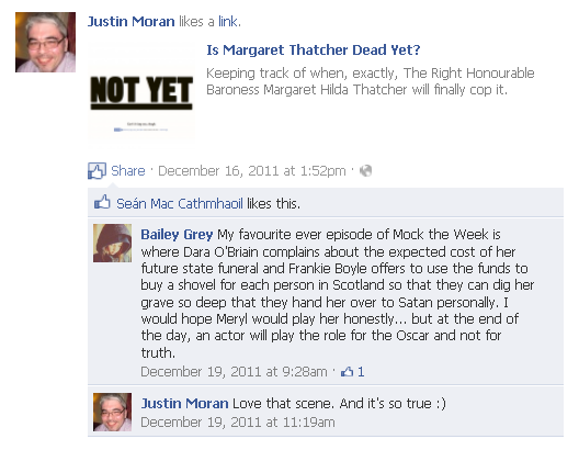 Justin Moran of Amnesty International (Ireland) looks forward to the death of Margaret Thatcher, Dec 2011.