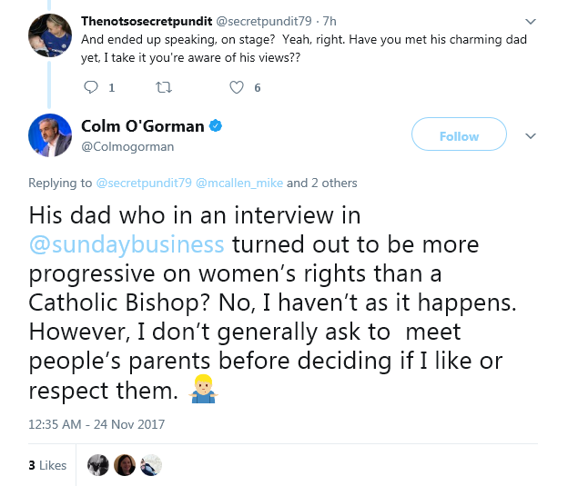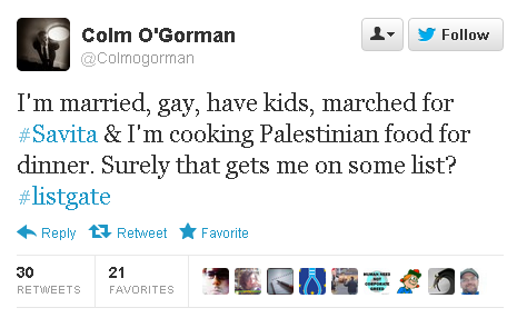 Colm O'Gorman issues a rather self-satisfied tweet on 8 Dec 2012.