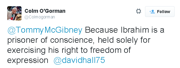 Colm O'Gorman, 12 Aug 2014, who is gay, defends the Muslim Brotherhood prisoner Ibrahim Halawa as a "prisoner of conscience".