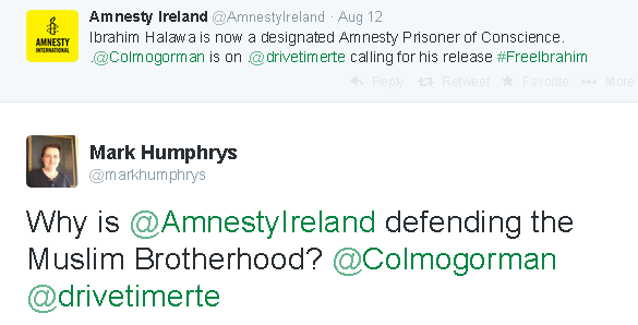 Under Colm O'Gorman, Amnesty Ireland campaigned for four years for the Halawa family of Muslim Brotherhood radicals. They, not me, are the kind of people Amnesty Ireland likes.