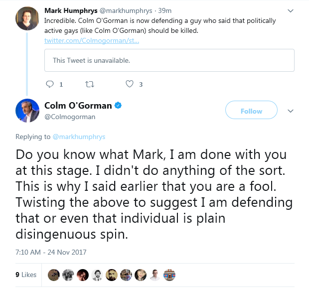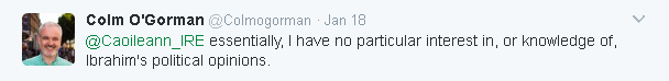 I try in Dec 2016 to get Colm O'Gorman to engage with the fact that Ibrahim Halawa's father said gays should be executed.