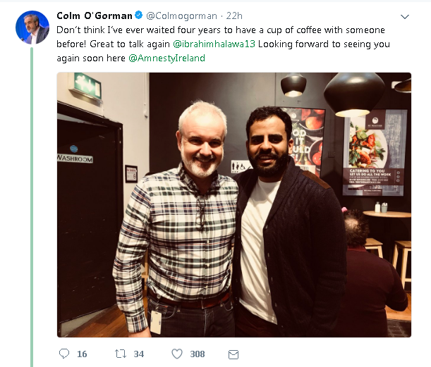 Colm O'Gorman of Amnesty International (Ireland) posts his love for Muslim Brotherhood activist Ibrahim Halawa on the latter's release from prison, Nov 2017.