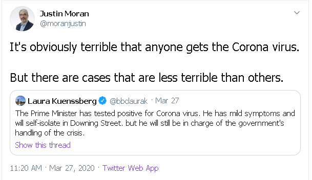 He has not changed. Here he laughs at the British Prime Minister Boris Johnson getting the coronavirus, March 2020.