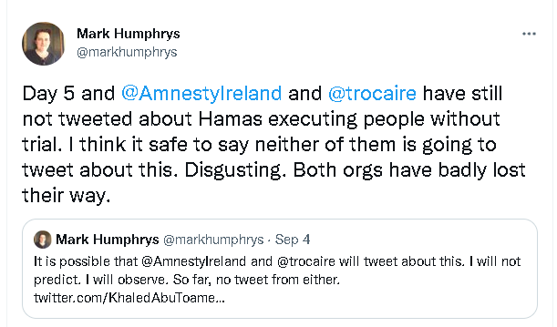 Amnesty Ireland and Trocaire, who have opinions on literally everything in Israel, decline to tweet about it.