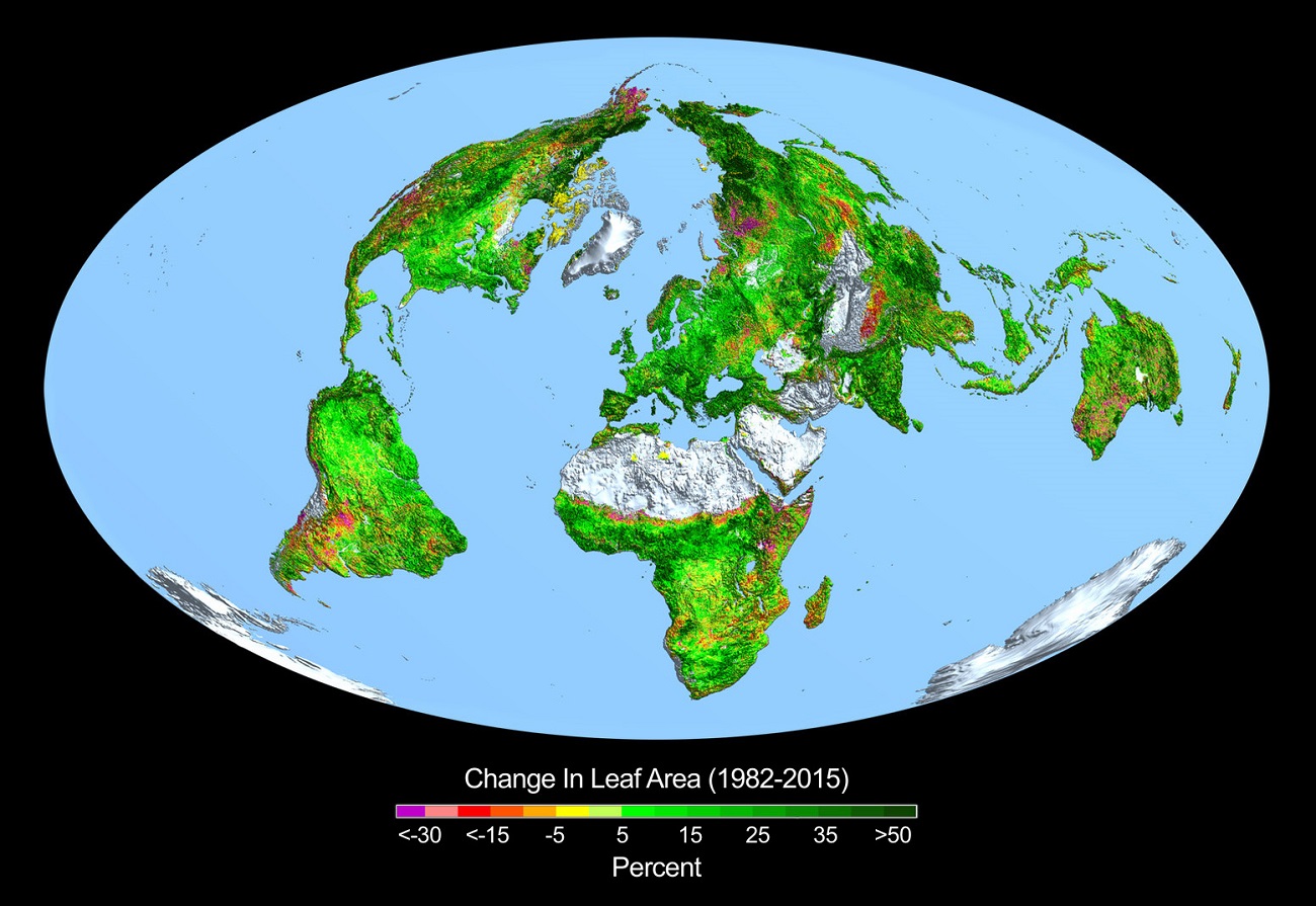 Change in leaf cover over the planet's vegetated regions from 1982 to 2015.