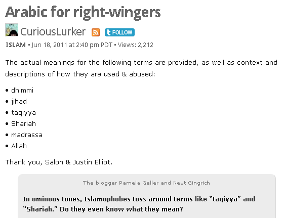 "Elliott purports to expose the ignorance of the various evil "right-wingers" he quotes, but he allowed himself to be played by Esposito, who left out of his explanations the aspects of the words that showed the "right-wingers" to be a lot closer to correct about Islam than Justin Elliott will ever be."