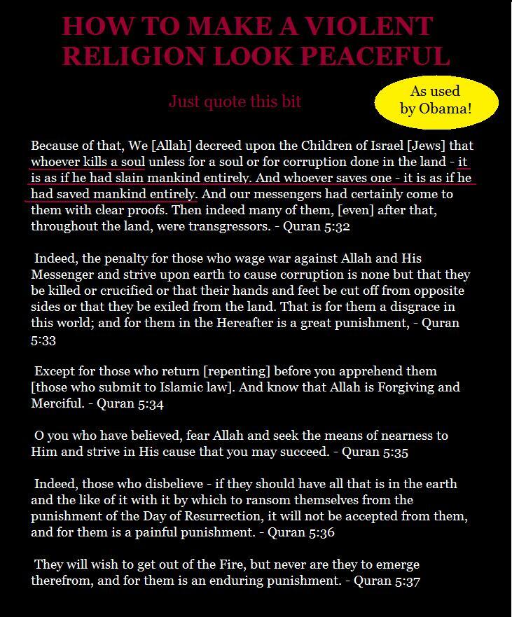 to "prove" that Islam is peaceful: "For that cause We decreed for the Children of Israel that whosoever killeth a human being