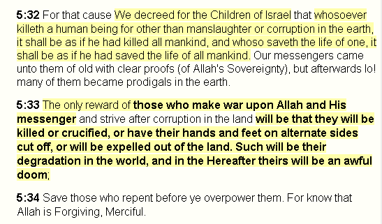 which immediately follows it, and somehow is never quoted by the anti-counterjihad people: "The only reward of those who make war upon Allah and His messenger and strive after corruption in the land will be that they will be killed or crucified, or have their hands and feet on alternate sides cut off, or will be expelled out of the land. Such will be their degradation in the world, and in the Hereafter theirs will be an awful doom;"