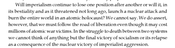 "we must follow the road of liberation even though it may cost millions of atomic war victims."