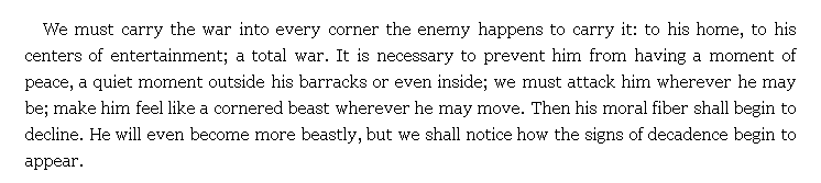 "We must carry the war into every corner the enemy happens to carry it: to his home, to his centers of entertainment; a total war. It is necessary to prevent him from having a moment of peace".