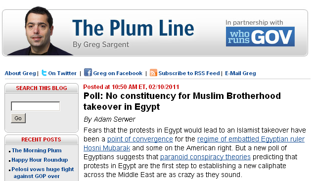 "In the 2011 parliamentary elections, three-quarters of the vote went to either the Muslim Brotherhood or their principal rivals, the Even More Muslim Brotherhood. So, statistically speaking, a fair few of the "broad-based coalition" joining the Coptic Christians and urban secularists out on the streets are former Morsi guys.