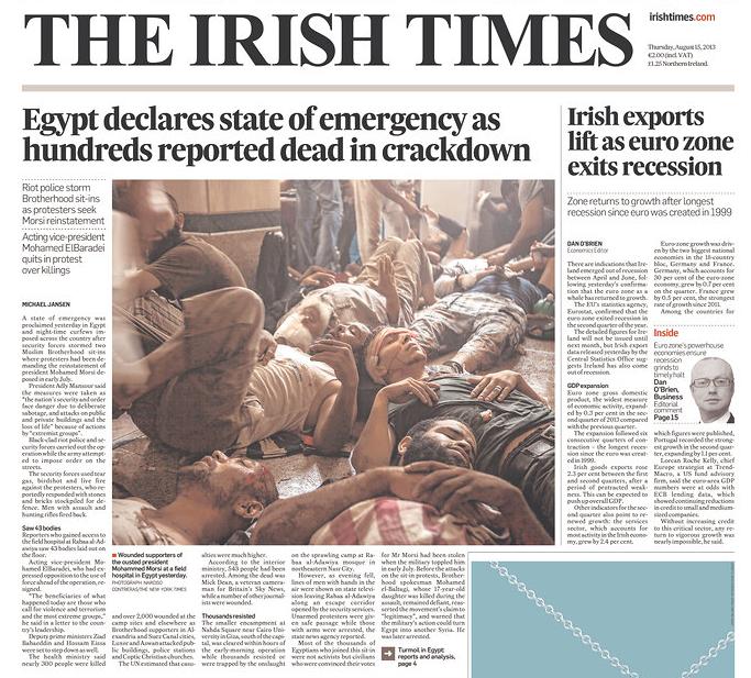 Emotional front page of Irish Times, 15 Aug 2013, wants us to have sympathy for supporters of Islamic fascism.