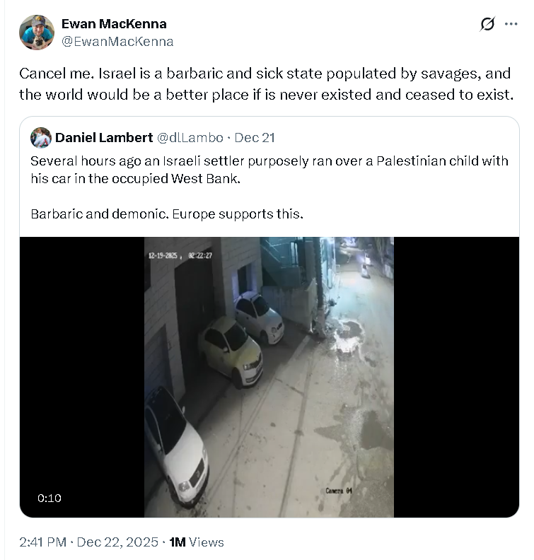 I had thought before 7 October that Ewan MacKenna was getting better, that his deranged hatred for the Jewish state was dying down