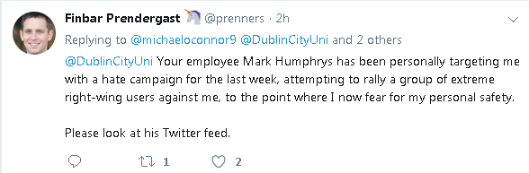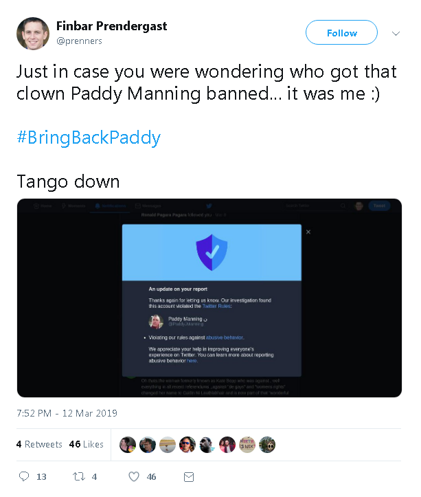 In March 2019, a malicious Twitter user called "Finbar Prendergast" (user prenners, less than 50 followers) abused the Twitter complaints process in order to get Twitter to ban popular right-of-centre Irish commentator Paddy Manning (user paddyjmanning, 12,000 followers).