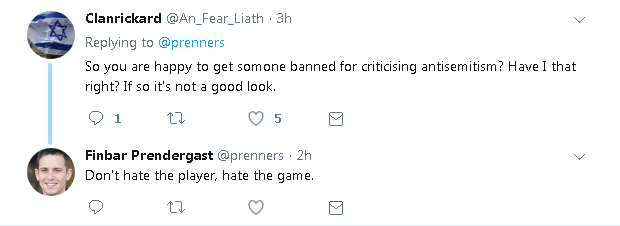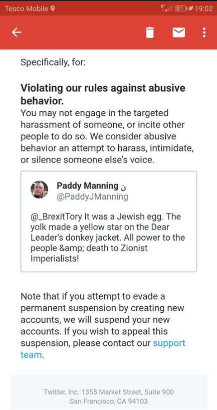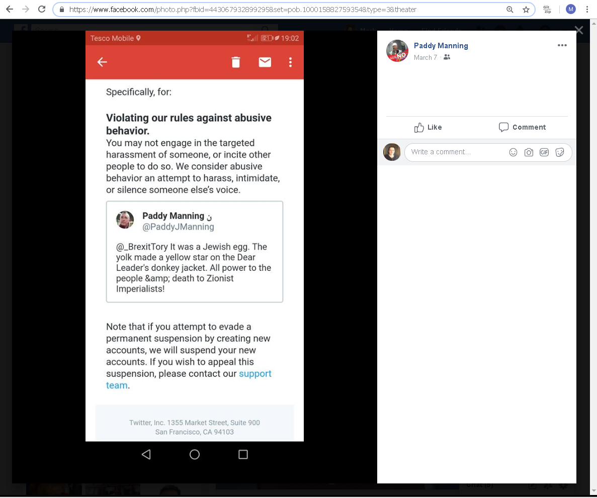 This guy Finbar Prendergast, who disagrees with Paddy's politics, decided to try to get Paddy banned for the above tweet. So he made a malicious complaint. Maybe the AI bot or outsourced worker dealing with the complaint could be fooled into thinking Paddy's tweet was anti-semitic, rather than slagging off anti-semites.