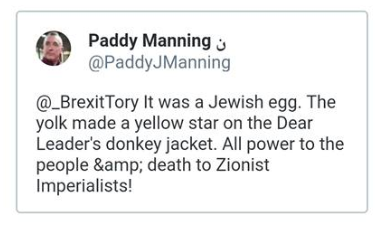 Paddy Manning tweeted this harmlessly amusing tweet after an egg was thrown at the extremist British politician Jeremy Corbyn on 3 March 2019.