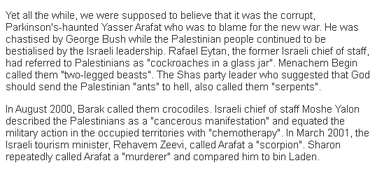 Fisk is piously appalled at Israelis who call the Jew killing monster a "scorpion", and compare him to Bin Laden,