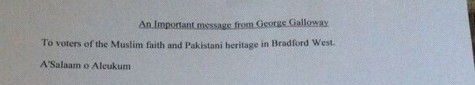Extracts from Galloway's UK by-election leaflet, March 2012.