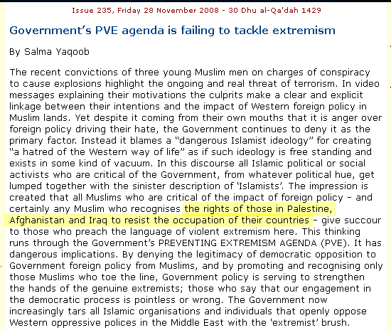 Government's PVE agenda is failing to tackle extremism, Salma Yaqoob, The Muslim News, 28 November 2008.