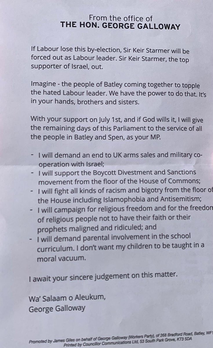 George Galloway leaflet in Batley and Spen by-election, July 2021, promotes sharia blasphemy laws.