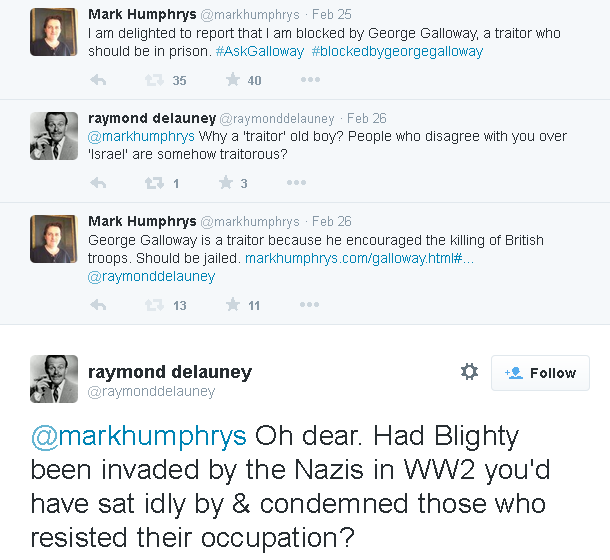 Feb 2015: A Galloway fan, "raymond delauney" (fake name) defends Galloway's statements calling for the killing of British troops.