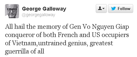 How George Galloway reacted to the death of the North Vietnamese communist General Giap, 5 Oct 2013: "All hail the memory".