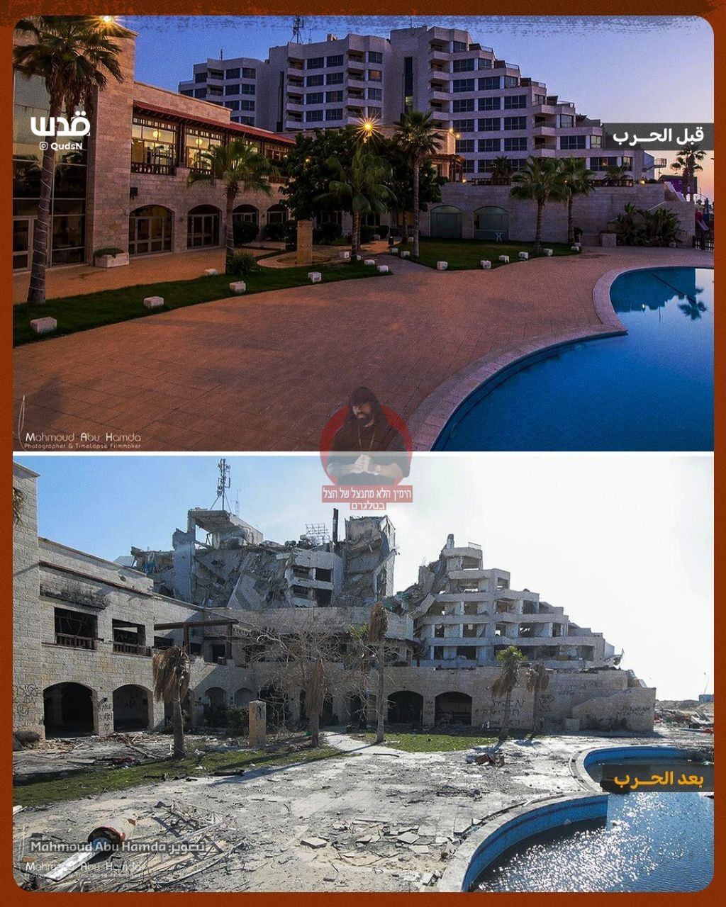 Another view of Al Mashtal Hotel before and after the 7 Oct 2023 war.