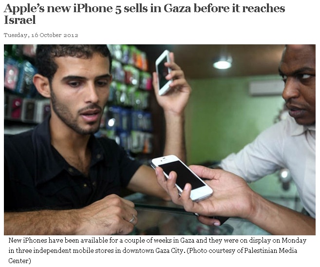 Reuters report: "The iPhone 5 will not be available until December from mobile operators in tech-mad Israel ... But the phones have been available for a couple of weeks in Gaza and they were on display on Monday in three independent mobile stores in a one-block radius in downtown Gaza City."