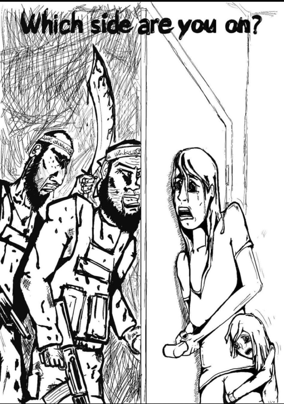 (Right) The Gaza/Israel border, 2023: A Jewish mother tries to protect her babies from the modern day Nazis.
