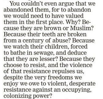 ... Because they choose to resist, and the violence of that resistance repulses us, despite the very freedoms we enjoy we owe to violent, desperate resistance against an occupying, colonising power?"