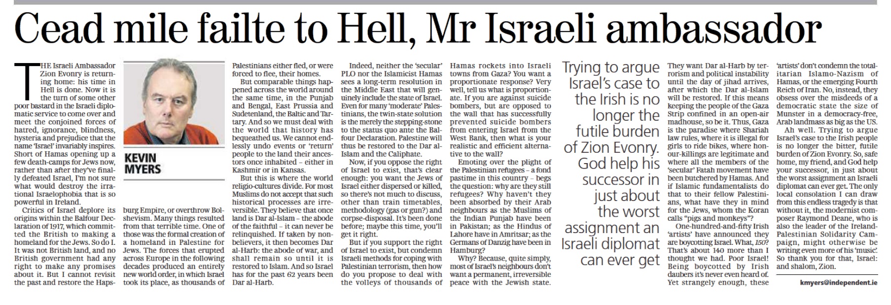 Cead mile failte to Hell, Mr Israeli ambassador, Kevin Myers, 20 Aug 2010, on Ireland's anti-Israel prejudice.