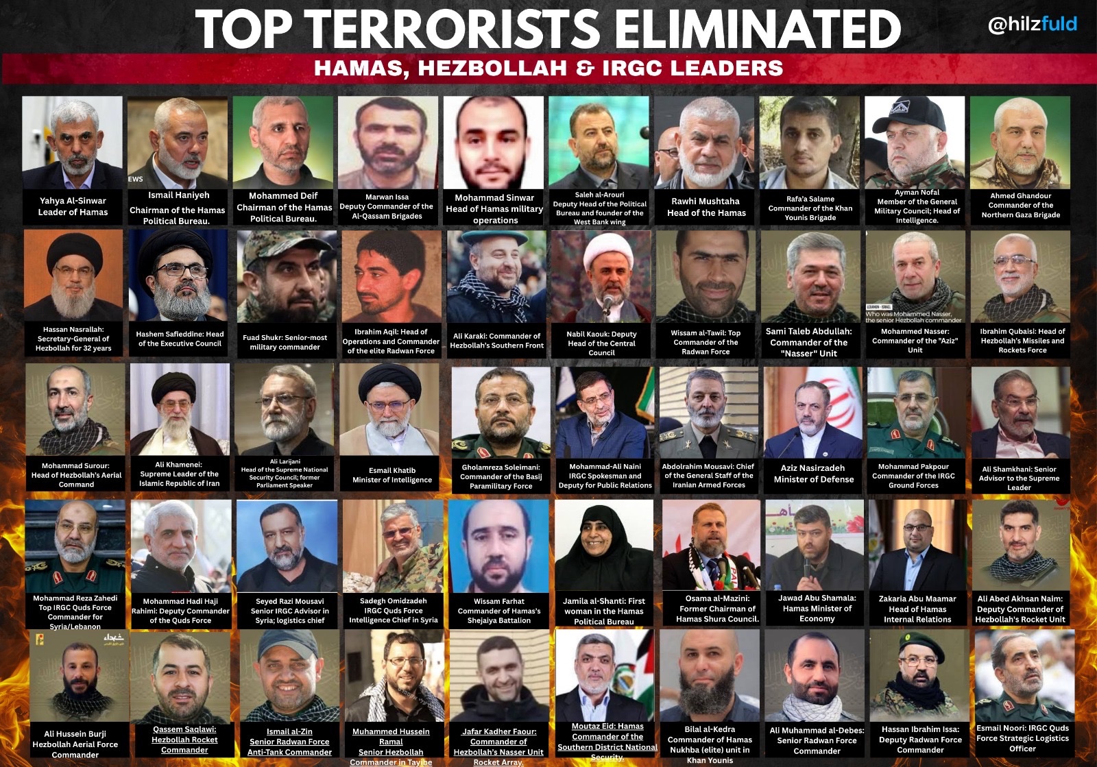 lists the "Axis of Resistance" leaders that have been killed (Iran, Hezbollah, Hamas, Houthis).
