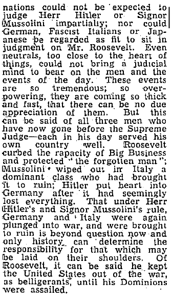 on the deaths of Roosevelt, Mussolini and Hitler,