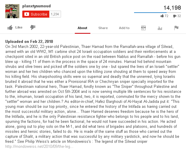 This video is about Thaer Hamad (or Tha'ir Hamad), the killer of Israeli civilian settlers in the Wadi al-Haramiya attack in March 2002.