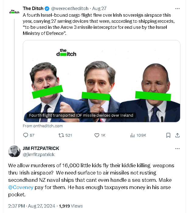 Jim Fitzpatrick, 27 Aug 2024, calls for Ireland to declare war on Israel and launch surface to air missiles against Israeli aircraft.