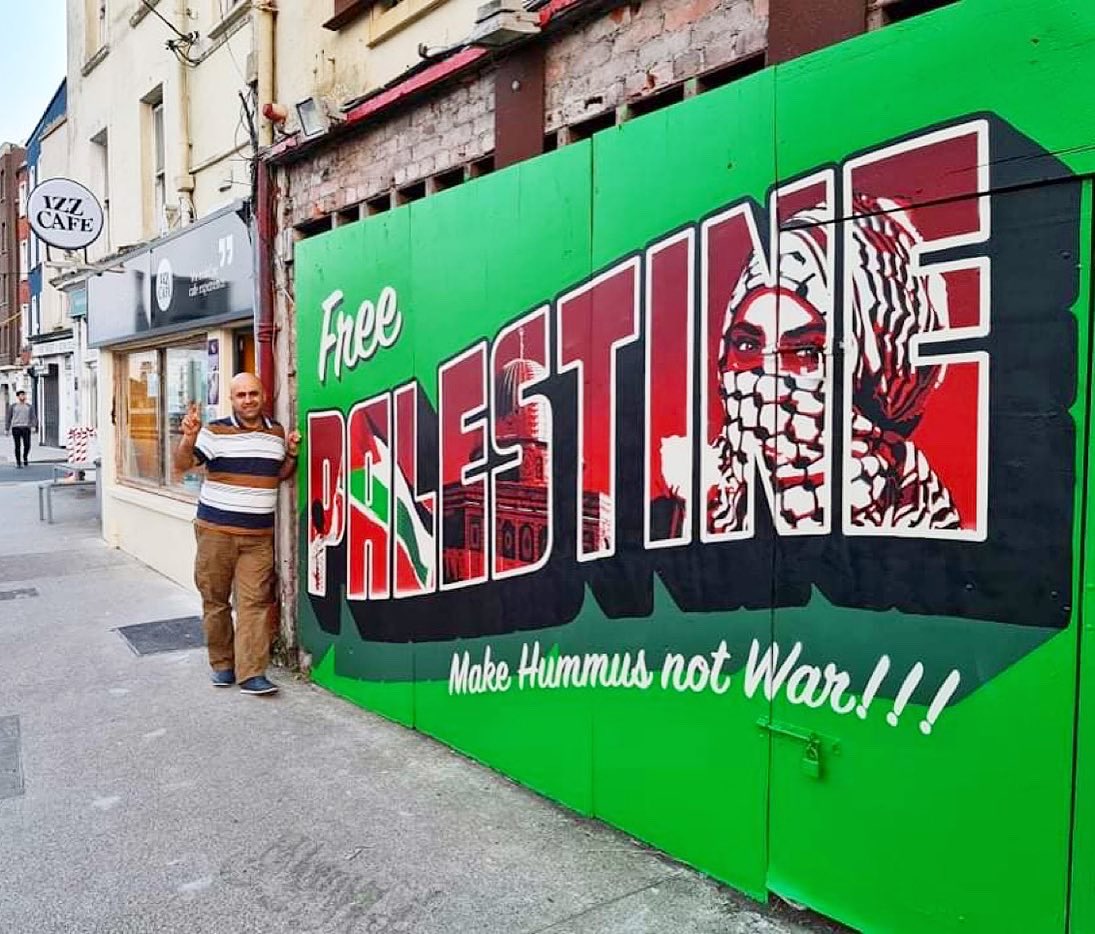 Words: "Free Palestine. Make Hummus not War!"