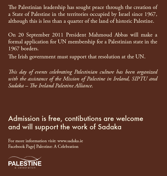 This is an event called "Palestine: A Celebration" hosted by SIPTU and the Palestinian Authority, 17 Sept 2011.