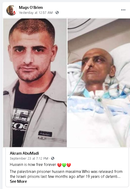 Mags O'Brien, 24 Sept 2021, mourns the death of Fatah terrorist Hussein Masalma.