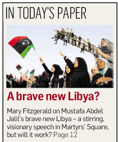 How the Irish Times, 14 Sept 2011, p.2, previews a speech by the head of Libya's interim government promising to enslave Libya under sharia law.