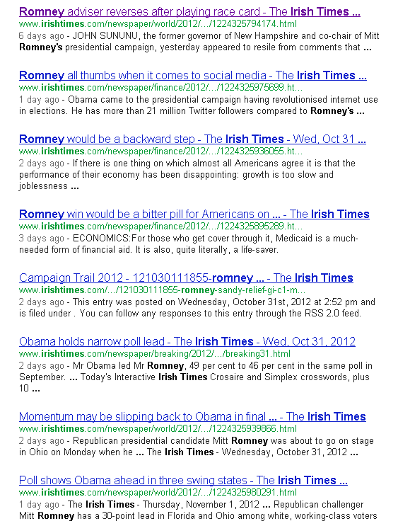 A Google search for "irish times" romney restricted to the last week before the election yields these headlines.